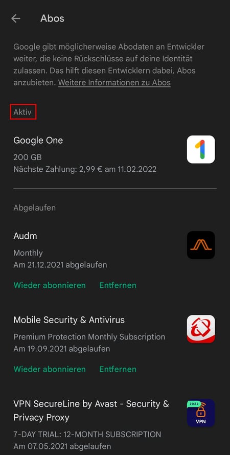 3. Tippen Sie auf den Eintrag „Abonnements“. Hier werden alle Ihre Abonnements angezeigt.