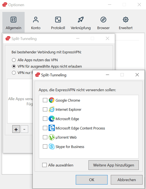 Eine Split-Tunneling-Funktion gibt es bei ExpressVPN ebenfalls: Sie können die VPN-Verbindung entweder nur auf ausgewählte Apps beschränken, oder bestimmte Apps vom VPN-Tunnel ausschließen.
