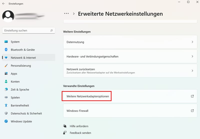 Netzwerk und Internet in den Einstellungen von Windows: Adapteroptionen ändern.