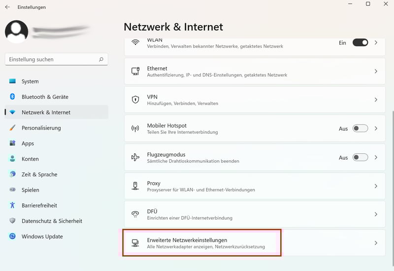 1. Wenn Sie Windows 11 nutzen, klicken Sie dazu auf den Windows Start Button, gehen Sie in die Einstellungen und klicken Sie im Bereich Netzwerk und Internet auf Erweiterte Netzwerkeinstellungen.