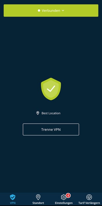 Über die Navigationsleiste unten wechseln Sie zwischen der VPN-Hauptfunktion, der Standortliste und den Einstellungen. Letztere sind nicht ganz so umfangreich wie beim Desktop-Verwandten (Stealth Guard fehlt beispielsweise), aber Split-Tunneling ist auch am Smartphone möglich und den DNS-Server können Sie hier ebenfalls manuell konfigurieren.