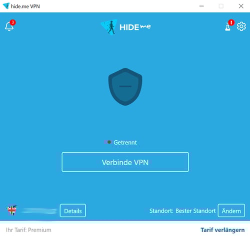 Die Anwendung ist schnell durchschaut: Im Startfenster nimmt der "Verbinde VPN"-Button die zentrale Position ein, mit dem Sie automatisch einen VPN-Tunnel zum besten Standort herstellen. Ihre aktuelle IP-Adresse wird stets unten links angezeigt, außerdem gibt es Buttons für Benachrichtigungen und neue Funktionen.
