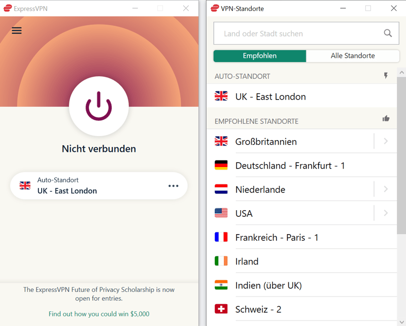 ExpressVPN liegt knapp hinter NordVPN auf Platz 2. In vielerlei Hinsicht sind sich die Programme sehr ähnlich: ExpressVPN ist ähnlich benutzerfreundlich und macht in allen unseren Testkategorien eine mindestens „gute“ Figur.