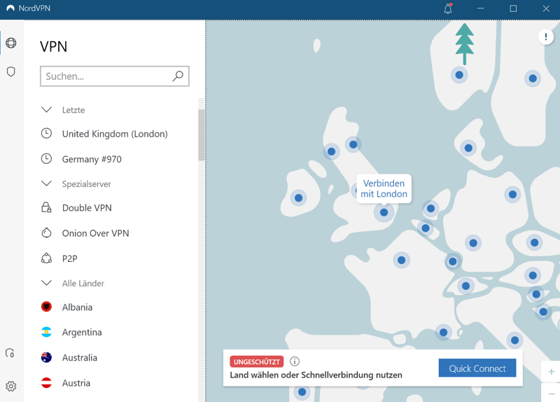 Bei NordVPN können Sie den Server-Standort entweder in einer interaktiven Karte oder in der Server-Liste daneben auswählen.