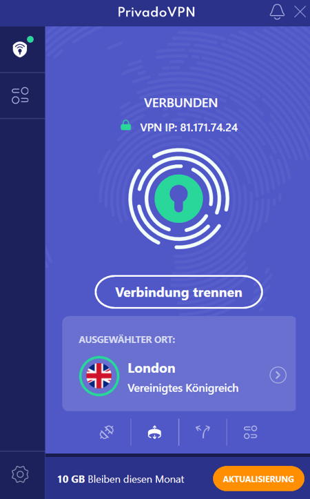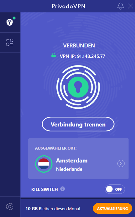 Dafür punktet PrivadoVPN mit einem ziemlich großzügigen Gratis-Tarif: Nutzer erhalten jeden Monat 10 GB Inklusivvolumen mit ungedrosselten Geschwindigkeiten.