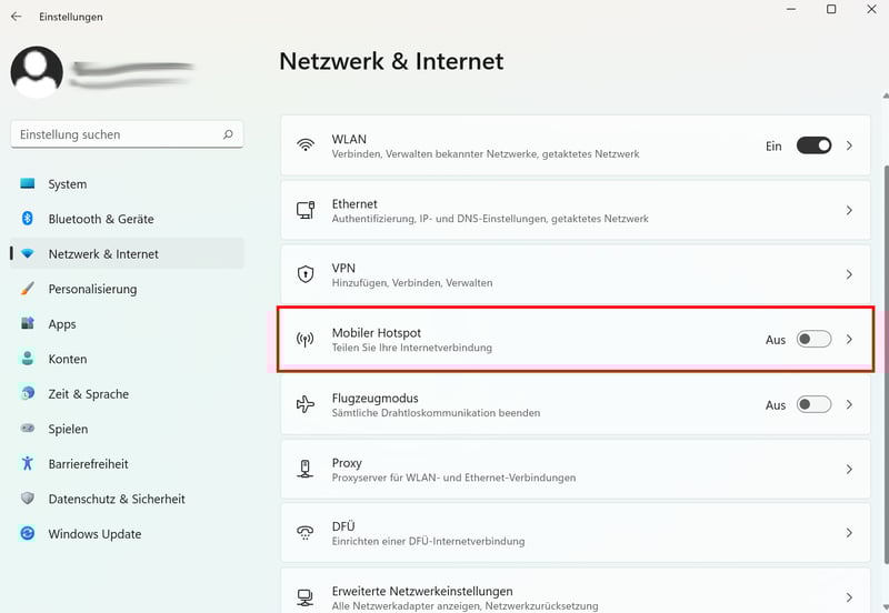 Schritt 1: Öffnen Sie die Windows-Einstellungen und klicken Sie unter „Netzwerk & Internet“ auf „Mobiler Hotspot“.