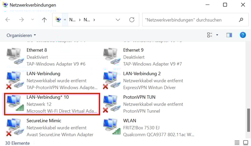 Schritt 3: Unter Ihren Netzwerkverbindungen sollten Sie nun den neuen WLAN-Hotspot finden. Er ist als „Microsoft Wi-Fi Direct Virtual Adapter“ gekennzeichnet. Achten Sie auf seinen Namen, den werden Sie gleich benötigen. In unserem Fall heißt er „LAN-Verbindung* 10″.