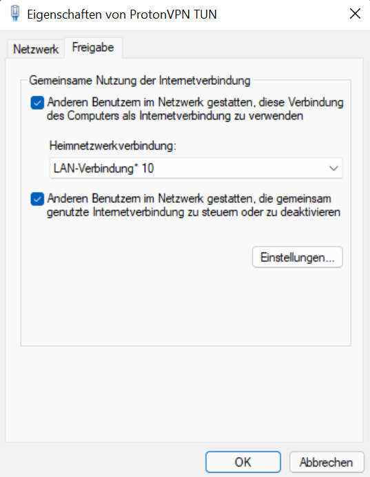 Wenn Sie keine VPN-Verbindung am Router einrichten möchten, können Sie auch Ihre Verbindung vom Computer per Ethernet-Kabel mit Ihrem Fernseher teilen. So geht es beispielsweise auf Windows 11: