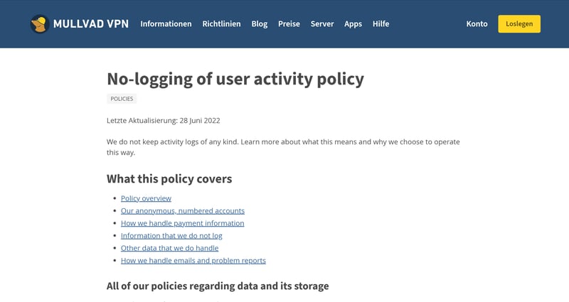 Auch Mullvad VPN gibt Informationen zu den Logging-Richtlinien und durchgeführten Audits.