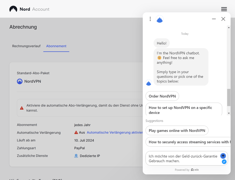 NordVPN nimmt es nicht so ernst mit Bezeichnungen: Die vom Anbieter versprochene „kostenlose Testversion“ ist nichts weiter als eine Geld-zurück-Garantie, von der Sie Gebrauch machen können, um innerhalb von 30 Tagen nach dem Abo-Abschluss Ihr Geld zurückzufordern. Denken Sie daran, rechtzeitig die automatische Abo-Verlängerung zu deaktivieren und den Support zu kontaktieren, um nicht in der Abo-Falle zu landen.