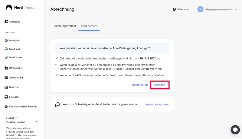 Sie erhalten Ihr Geld von NordVPN nur zurück, wenn Sie Ihr Abo rechtzeitig kündigen. Am besten tun Sie dies sofort nach Abschluss des Vertrags. So gehen Sie dabei vor: