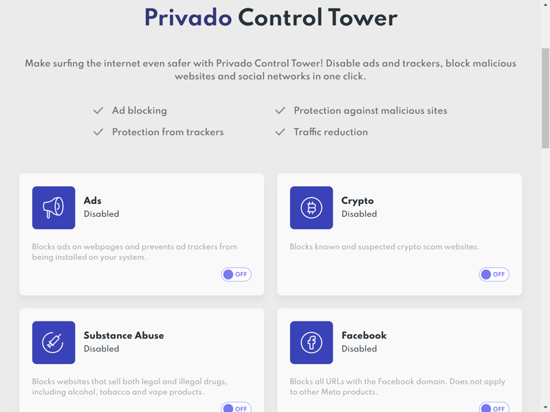 Ansonsten gibt es in der App keine nennenswerten Funktionen oder Einstellungen. Im Web-Portal finden Sie noch den Privado Control Tower, der Ads und betrügerische Websites (z. B. Ransomware, Phishing oder Crypto-Scams) sowie jugendgefährdende Inhalte und bestimmte soziale Medien blockiert.