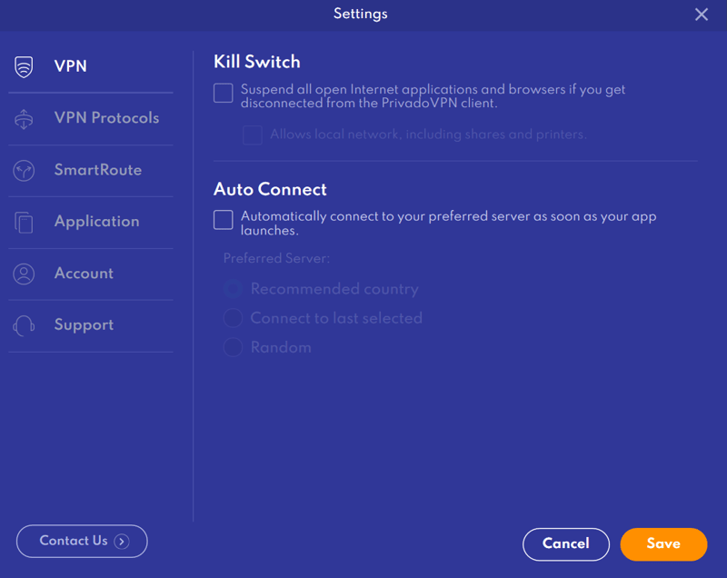 Ein Klick auf das Zahnrad-Symbol führt Sie zu den Features und Einstellungsmöglichkeiten von PrivadoVPN. Jene fallen recht sporadisch aus: Im Tab VPN finden Sie den bereits erwähnten Kill Switch und die Auto Connect-Funktion, mit der Sie die automatische VPN-Verbindung einrichten können. Darunter befindet sich die Protokoll-Auswahl, auf die wir im Kapitel Sicherheit und Privatsphäre näher eingehen.