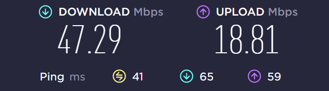Ohne VPN-Verbindung erreichten wir Download-Geschwindigkeiten von 75,71 Mbps und Upload-Geschwindigkeiten von 20,93 Mbps. Mit bestehendem VPN-Tunnel lag der Download noch bei 47,29 Mbps, der Upload bei 18,81 Mbps.
