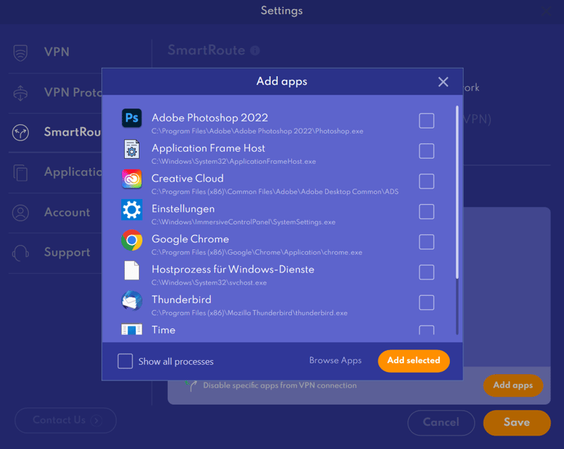 Hinter der Funktion SmartRoute verbirgt sich Split-Tunneling: Damit können Sie festlegen, welche Anwendungen PrivadoVPN durch den VPN-Tunnel leiten soll und welche nicht. Dabei haben Sie zwei Optionen: Sie können entweder gezielt Apps von der VPN-Verbindung ausschließen, oder jene auf bestimmte Anwendungen beschränken.