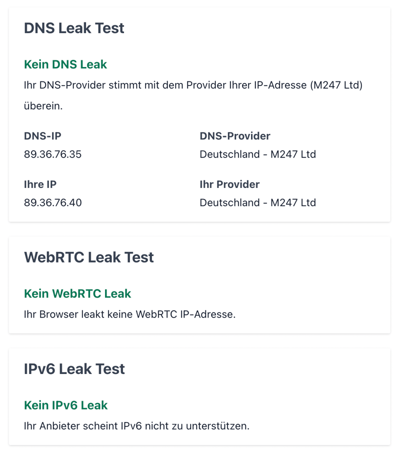 Positiv: Unsere VPN Leak Tests (IPv6, DNS und WebRTC) bestand PrivadoVPN allesamt mit Bravour.