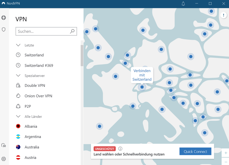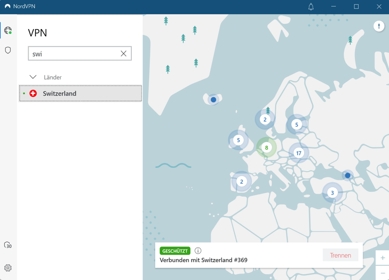 Die Schweizer Server finden Sie manuell in der Länderliste oder per Suchfunktion.