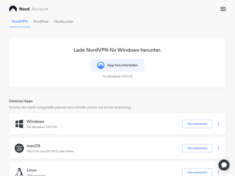 Schritt 1: Zunächst müssen Sie einen Account beim VPN-Anbieter erstellen und die passende App für Ihr Betriebssystem auswählen. Meist, wie hier bei NordVPN, werden die verfügbaren Apps im Nutzerbereich übersichtlich aufgelistet: