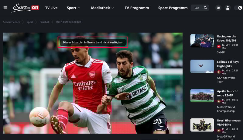 Grundsätzlich wird ServusTV auch in Deutschland ausgestrahlt, und auf die Mediathek des Senders haben Sie ebenfalls Zugriff. Hier können auch deutsche Besucher zahlreiche Serien, Filme und Sportsendungen ansehen. Manchmal – beispielsweise beim Versuch, Champions League zu schauen – wird Ihnen jedoch eine ärgerliche Fehlermeldung begegnen: