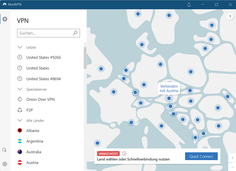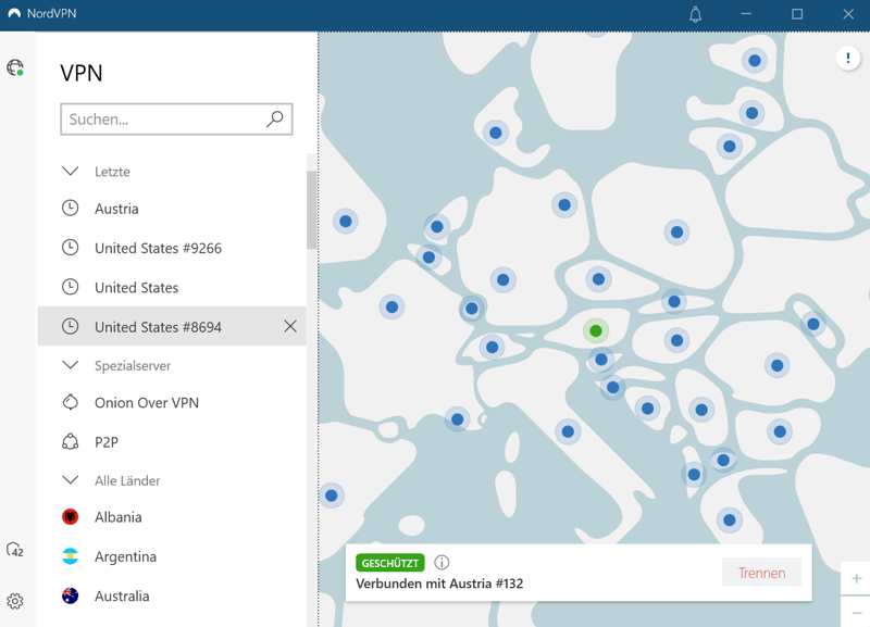 NordVPN verfügt über mehr als 5.500 Server weltweit, wobei 33 Server in Österreich zur Verfügung stehen. Neben ServusTV überwindet die Plattform auch die Geosperren von ORF und ATV.