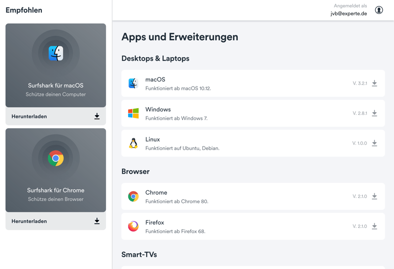 Die verschiedenen Surfshark-Anwendungen sind auf der Website übersichtlich aufgelistet und blitzschnell installiert. Weil es keine Gratis-Version gibt, müssen Sie erst einen Account erstellen und einen Tarif auswählen, damit die App Sie ins Dashboard lässt. Mehr zu den verschiedenen Surfshark-Tarifen lesen Sie im Kapitel "Preisgestaltung".