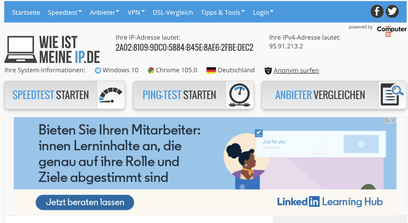 Pausieren Sie zunächst Ihre VPN-Verbindung und verbinden Sie sich mit der Webseite wieistmeineip.de. Jetzt sehen Sie Ihre eigene IP-Adresse. Schalten Sie das VPN wieder ein und gehen Sie erneut auf die Website. Die IP-Adresse, die jetzt erscheint, sollte sich von der zuvor gezeigten unterscheiden. Ist das nicht der Fall, funktioniert die VPN-Verbindung nicht korrekt.
