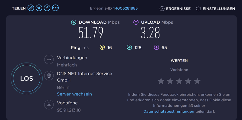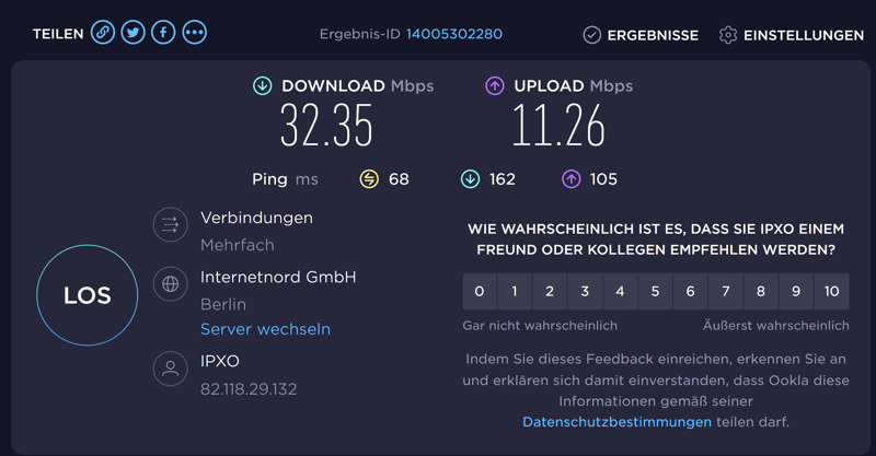 In diesem Fall scheint das VPN die Verbindung nicht signifikant zu verlangsamen. Die Upload-Rate ist sogar besser als ohne (wobei das an momentanen Schwankungen liegen kann).