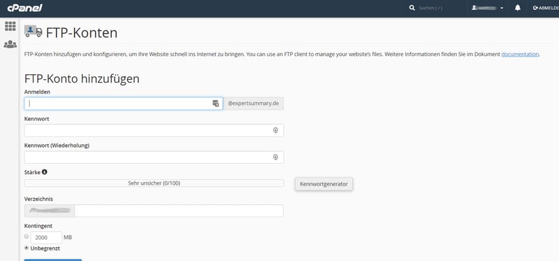 Eines dieser Module ist „FTP-Konten“. Hier können Sie neue FTP-Benutzer anlegen, indem Sie einen Anmeldenamen, ein Passwort und ein Verzeichnis festlegen. Ein sicheres Passwort erstellt Contabo auf Wunsch automatisch, was nützlich ist, wenn Sie keinen Passwort-Manager installiert haben. Außerdem können Sie das Kontingent auf Wunsch auf eine gewisse MB-Zahl beschränken.