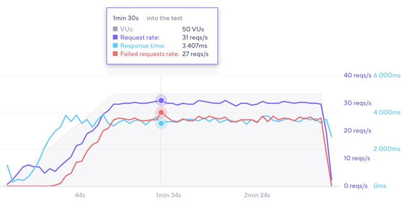 Den Test mit Cache bestand Contabo ohne Probleme (alle anderen Anbieter aus unserem Vergleich übrigens auch). Ohne aktivierten Cache sah es leider anders aus: Eine hohe Error-Rate (rote Linie in der Grafik unten) bei wachsenden Anfragen (violette Linie) deutet auf eine Überlastung des Servers hin, denn die Website war plötzlich leider nicht mehr zu erreichen.