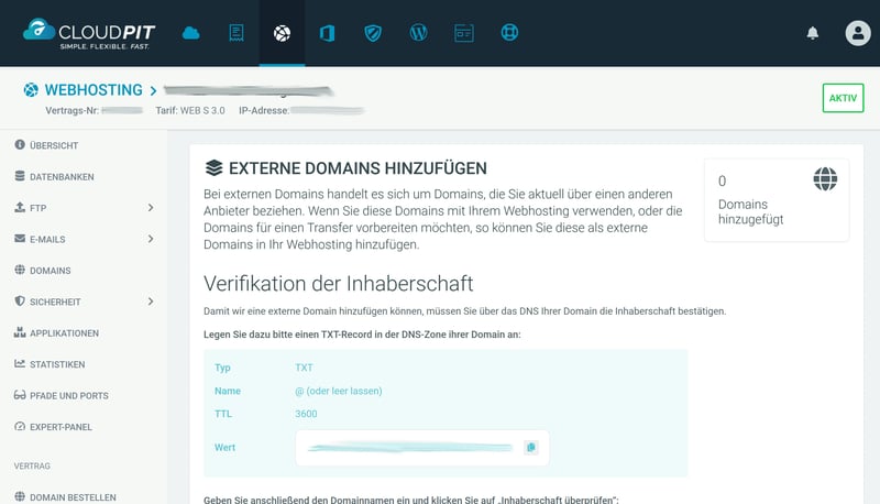 Als wir dogado zum letzten Mal testeten, war das Aufschalten und Nutzen externer Domains aufgrund potenzieller Sicherheitsrisiken, beispielsweise bei DDos-Attacken, noch nicht möglich. Das hat sich mittlerweile geändert: Klicken Sie im Bereich „Webhosting & Domains“ neben Ihrem Webhosting-Vetrag auf „mehr“ und im Dropdown-Menü auf „Externe Domains hinzufügen“.