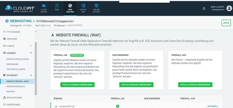 Ihre Webhosting-Instanz liegt bei dogado in virtuellen Containern, die vom Verhalten anderer Kunden nicht beeinflusst werden können. Für zusätzliche Sicherheit gibt es außerdem eine Web-Application-Firewall, die Angriffe erkennt und abwehrt. Jene verwalten Sie ebenfalls im Sicherheits-Bereich.