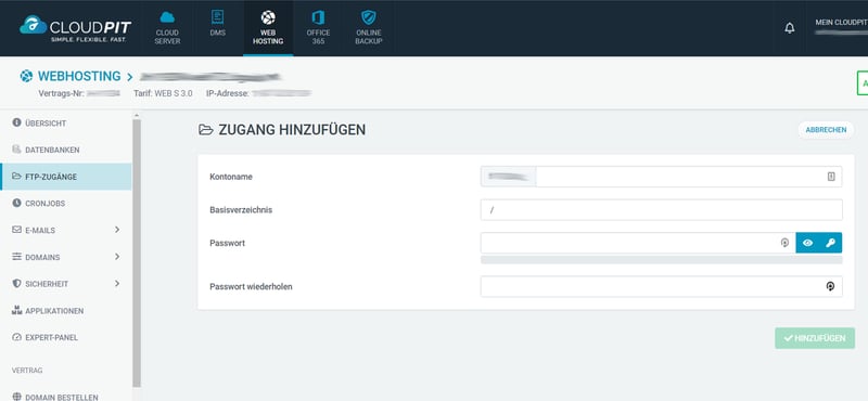 Im Webhosting-Bereich der CloudPit-Benutzeroberfläche können Sie nun alle wichtigen Hosting-Einstellungen vornehmen – einen neuen FTP-Zugang anlegen, zum Beispiel. Im Untermenü „FTP-Zugänge“ verwalten Sie Ihre aktuellen Zugänge und fügen neue mit wenigen Klicks hinzu. Ein sicheres Passwort generiert CloudPit dabei auf Wunsch automatisch.