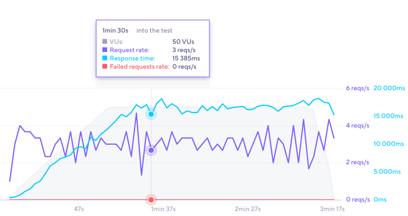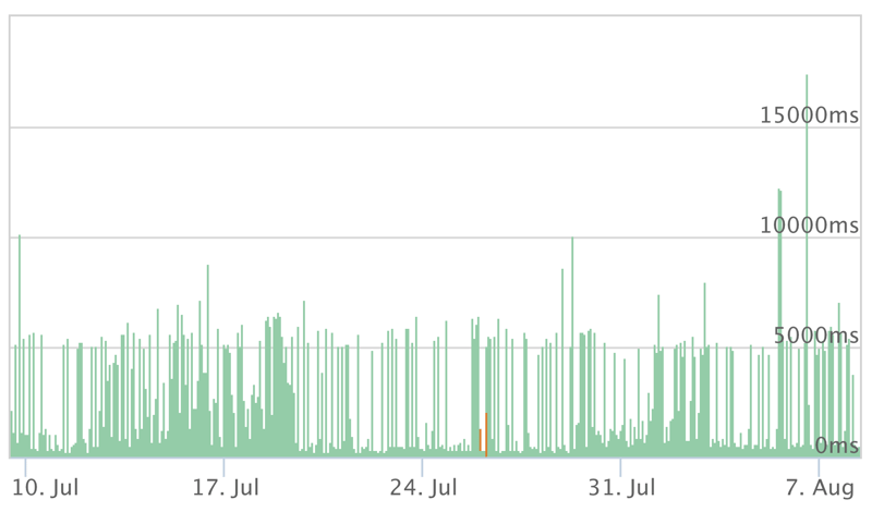 Mit Cache verlief alles problemlos (genau wie bei allen anderen Anbietern aus unserem Test), doch ohne Cache stieg die Antwortzeit stark an, wie die folgende Grafik zeigt. Die blaue Linie markiert die Antwortzeit, die graue Fläche die Zahl der Besucher:
