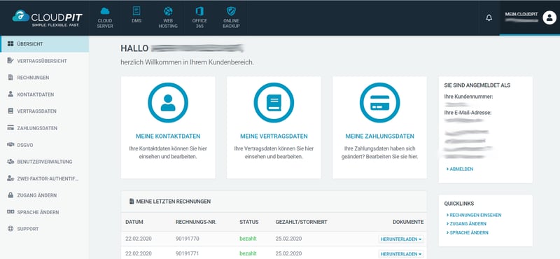 Die gesamte Bedienung, einschließlich Verwaltung und Technik, findet in dogados Control-Panel CloudPit statt. Im Hauptmenü links finden Sie die wichtigsten Verwaltung-Optionen. Hie verwalten Sie Ihre Verträge, sehen Rechnungen ein, aktivieren die 2-Faktor-Authentifizierung, bearbeiten Ihre Stammdaten und mehr.