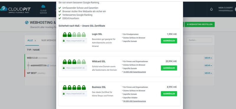 Kostenloser SSL-Schutz von Let’s Encrypt steht Ihnen ab dem Tarif Web M zur Verfügung. Zusätzlich können Sie sich in der Webhosting-Zentrale weitere SSL-Zertifikate nach Maß dazubuchen, die Sie monatlich bezahlen.