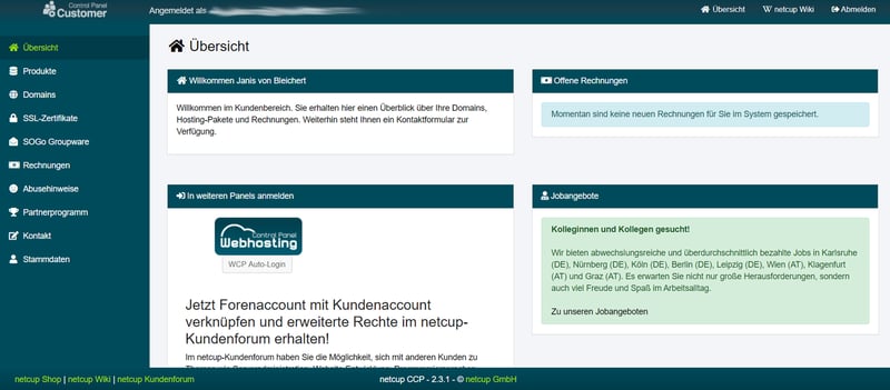 Das Webhosting Control Panel hat netcup unserer Meinung nach im Produktbereich etwas versteckt: Um es zu erreichen, klicken Sie hinter „Login-Name im Verwaltungspanel“ auf „Auto-Login WEB“. Aber wenn man den Button erst entdeckt hat, verankert er sich im Auge.