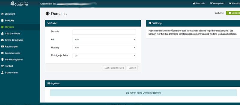 Zur Domainverwaltung gelangen Sie über das Hauptmenü, direkt unter Ihren Produkten. Hier finden Sie eine Liste Ihrer Domains und prüfen die Verfügbarkeit Ihrer Wunsch-Domains. Neue Subdomains hingegen legen Sie im Webhosting Control Panel an.