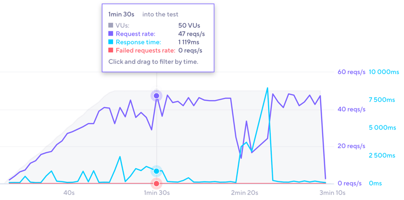 Die blaue Linie zeigt die Entwicklung der Antwortzeit, die graue Fläche die steigende Besucherzahl inkl. Anfragen pro Sekunde (violette Linie).