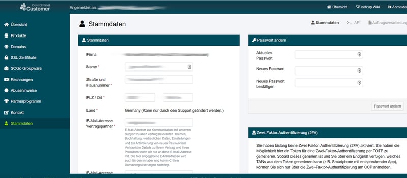 Bearbeiten Sie Ihre Stammdaten und richten Sie zur Sicherheit 2FA ein.