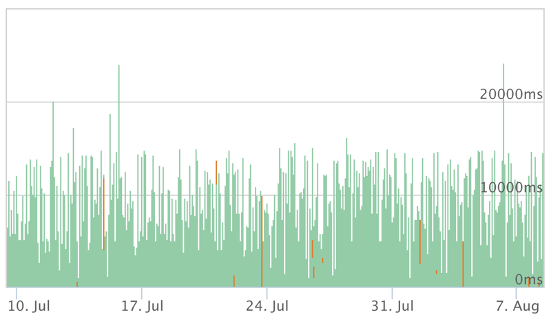 Die folgende Grafik zeigt die Entwicklung der Time to First Byte anhand der jeweils schlechtesten Antwortzeit pro Stunde. Wie Sie sehen, bot sich in unserem Testzeitraum ein ständiges Auf und Ab, was nicht ideal ist: