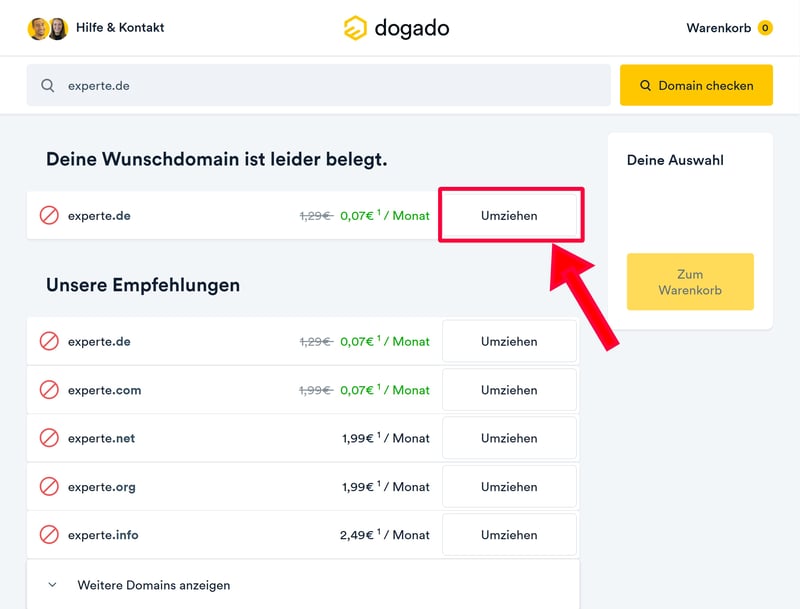 Schritt 2: Wenn Sie den Auth-Code haben, können Sie den Umzug bei Ihrem neuen Hosting-Anbieter in die Wege leiten. Bei dogado geben Sie die Domain, die Sie umziehen möchten, einfach in der Domainsuche ein und klicken im passenden Eintrag auf „Umziehen“.