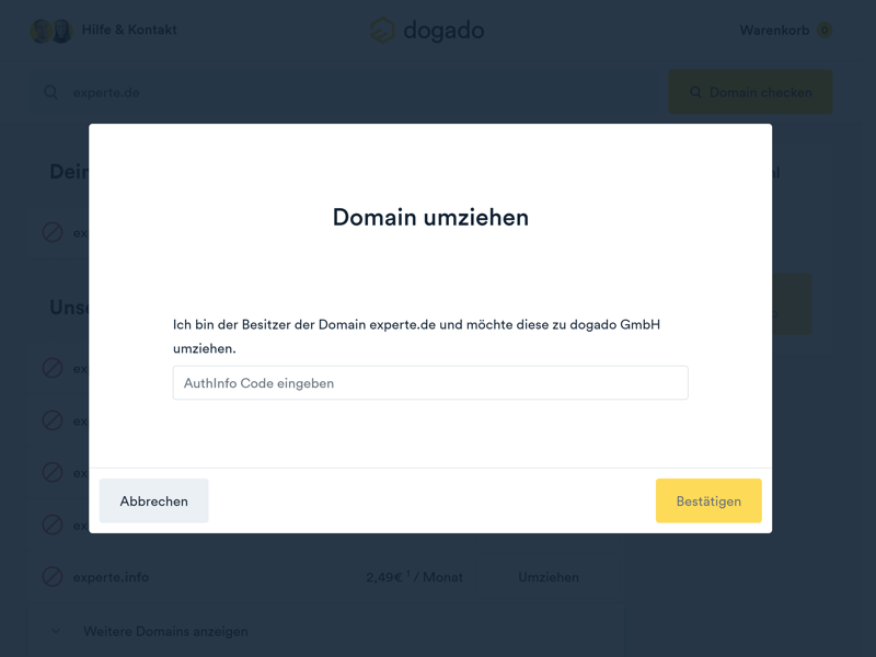Schritt 3: Nun müssen Sie den Auth-Code, den Sie vom alten Anbieter erhalten haben, eingeben. Die Domain wird dann zu dogado umgezogen.