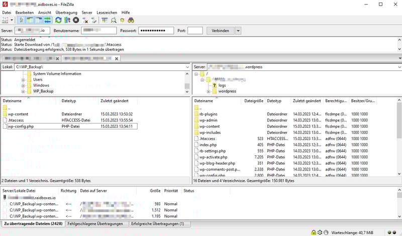 Im Anschluss können Sie ein FTP-Programm wie FileZilla verwenden, um alle Dateien Ihrer Website vom alten Server auf Ihren lokalen Computer herunterzuladen. Dann verbinden Sie sich via FTP zum Server des neuen Hosting-Anbieters, wo Sie die Daten im Verzeichnis Ihrer Website hochladen.