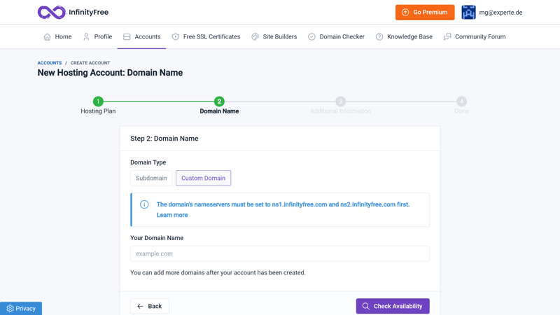 Qualität und Umfang des Gratis-Hostings von InfinityFree sind tatsächlich ein Level über vergleichbaren Freemium-Angeboten. Sie können unbegrenzt viele Websites werbefrei hosten, ohne strikte Bandbreite-Limits, und unbegrenzt viele Gratis-Subdomains nutzen. Sie können aber auch eine benutzerdefinierte Domain, die Sie bereits besitzen, mit Ihrem Gratis-Webspace verbinden.
