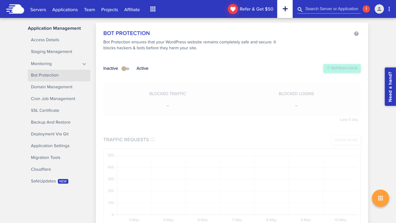 Der in allen Tarifen integrierte Malware-Schutz von Cloudways heißt Bot Protection. Er lässt sich in der WordPress-Verwaltung im gleichnamigen Untermenü aktivieren.