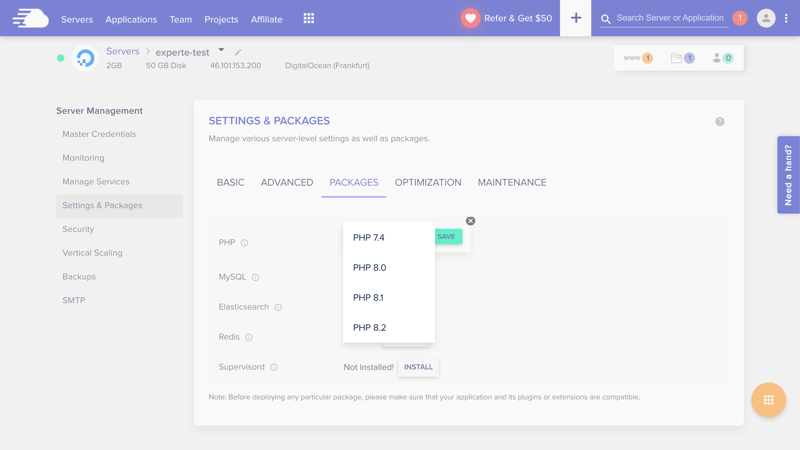 Standardmäßig war bei uns nach der Installation eine ältere Version eingestellt. Der Wechsel ist jedoch unkompliziert: Rufen Sie das Server Management-Menü Ihres Servers auf und navigieren Sie im Menüpunkt „Settings & Packages“ zum Tab „Packages“.