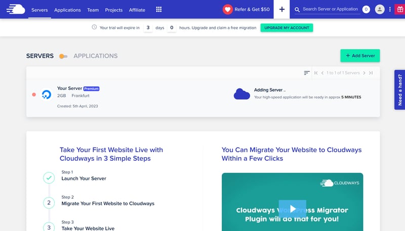 Support ist im Cloudways-Dashboard immer nur einen Klick entfernt. Wenn Sie rechts auf den „Need a hand“-Button klicken, öffnet sich ein Hilfefenster, das Sie zu den Kontaktmöglichkeiten und den Support-Inhalten führt.