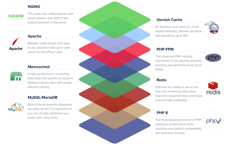 Die Cloudways-Entwickler sind auf den hauseigenen PHP-Tech-Stack so stolz, dass sie ihm einen eigenen Namen spendiert haben: Der „Thunderstack“ soll durch die einzigartige Kombination seiner Technologien eine „schockierend gute“ Performance liefern. So sieht er aus: