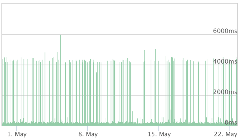 In der folgenden Grafik sehen Sie die Entwicklung der Time to First Byte in unserem sechswöchigen Testzeitraum anhand der jeweils schlechtesten Antwortzeit pro Stunde. Zwar gibt es immer wieder Ausschläge, die auf längere Antwortgeschwindigkeiten hindeuten, doch die Baseline ist bei Cloudways sehr niedrig: