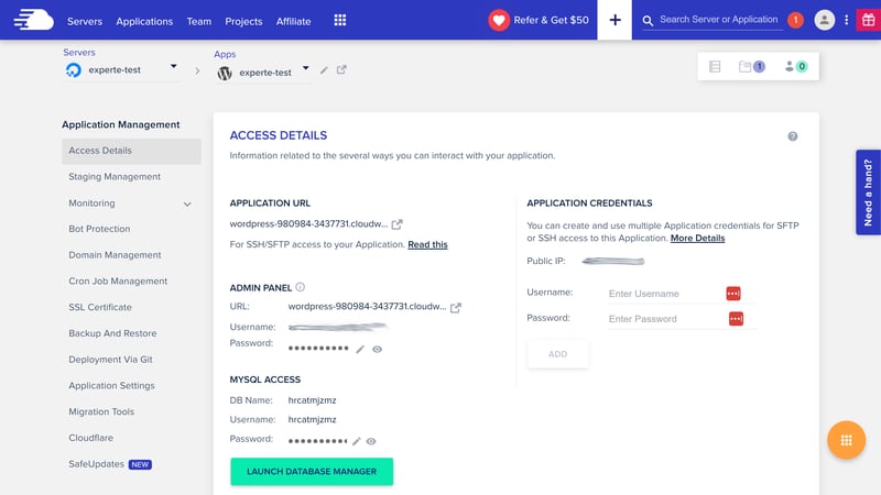 Wenn Sie direkt auf Ihre Datenbank zugreifen möchten, können Sie den eingebauten Datenbank-Manager von Cloudways nutzen. Sie finden ihn in den „Access Details“, also der Startseite der Verwaltung Ihrer WordPress-Instanz.